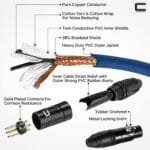 Each cable is comprised of top quality materials including 22 AWG oxygen-free copper conductors and gold-plated end connectors for corrosion resistance.
